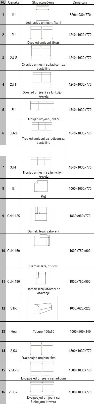 Tehničke karakteristike: drvo-bukva, iveral, sjedište:PU pjena 25kg/m3, naslon: pjena soft E22, val opruge, lesonit, platno ili eko koža po izboru.